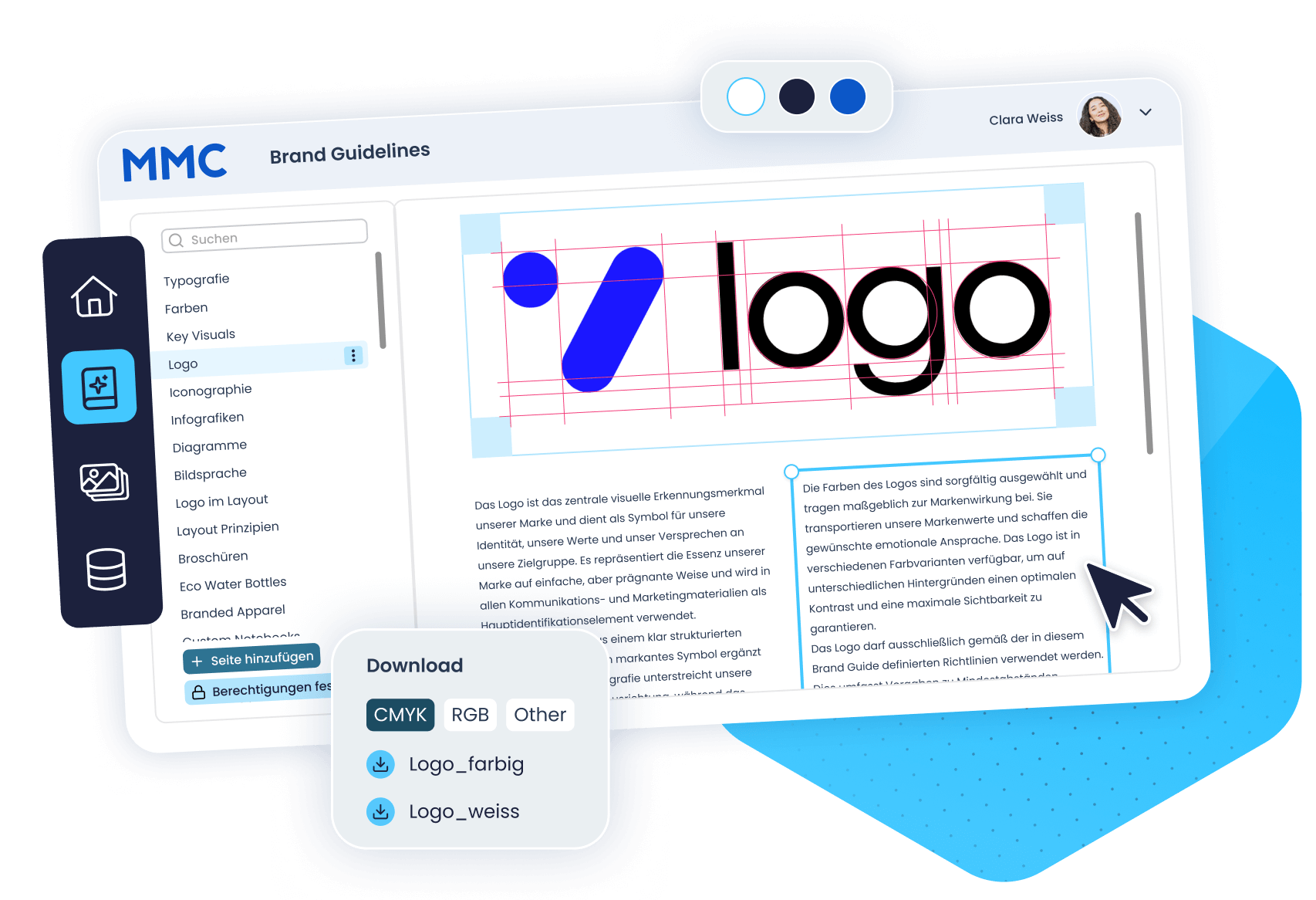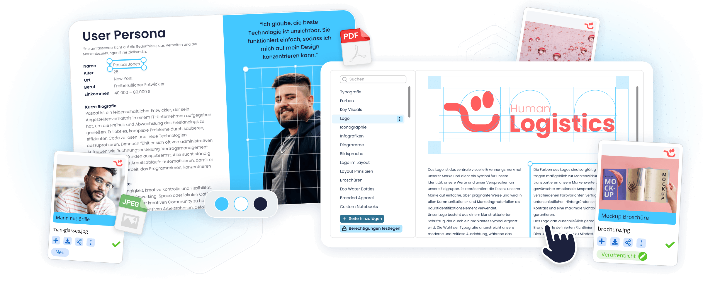 Ein PDF, das niemand öffnet, schützt keine Marke. Der Brand Hub bündelt alle visuellen CI-Vorgaben Ihrer Marke: Farben, Schriften und Gestaltungsregeln sind strukturiert, durchsuchbar und direkt mit den passenden Assets verknüpft. Wer gestaltet, findet hier die verbindliche Grundlage: Ohne Rückfragen, ohne Interpretationsspielraum.