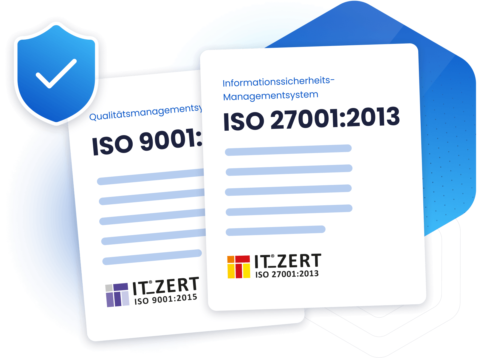 ISO 27001:2013 - Informationssicherheits-Managementsystem. Abgedeckt sind Vertraulichkeit, Integrität und Verfügbarkeit aller verarbeiteten Informationen.